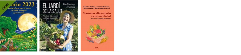 GROS, Michel. Llunari : calendari lunar per l’hort i el jardí ecològics i també per mantenir la salut. Castellvell : Artús Porta Manresa, 2023. 63.19 Gro MARTÍNEZ, Pere. El jardí de la salut. Conesa : Ushuaia, 2022. 63.51 Mar MEDINA, F. Xavier. Consumo alimentario y sostenibilidad : ¿hacia una sociedad sostenible? Barcelona : mra ediciones, 2021. 613.2 Con